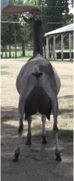 Lily’s beautifully wide and flat rump is a standout in our herd. She belonged to a local 4-Her since she was a kid, and we are happy to have her back. Lily is very sweet-tempered and easy to handle.