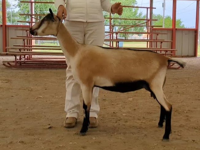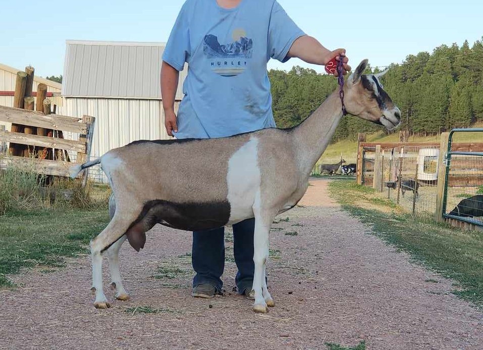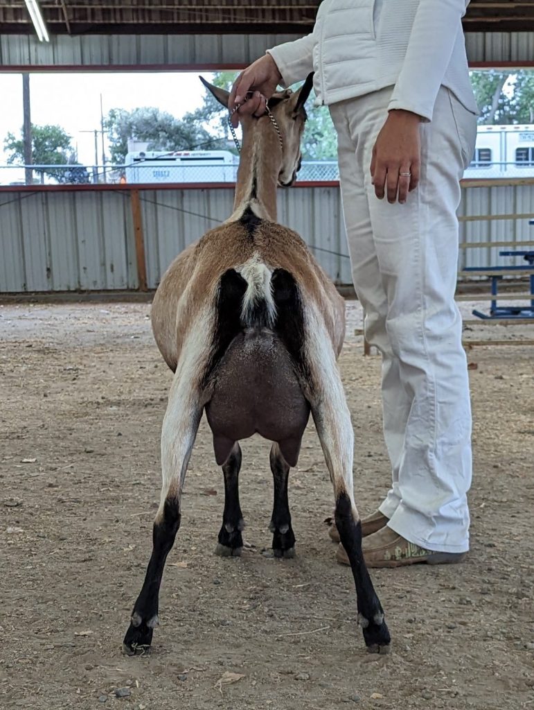 Simile’s topline always catches my eye in the barn. She is so level and wide, and has been since she was a kid. She also has a beautifully shaped udder that is a favorite to hand-milk. When she first freshened, she didn’t develop much capacity in the first lactation. She rectified this in her second freshening. Her attitude agreeable, so she is also the first doe I grab for showmanship.