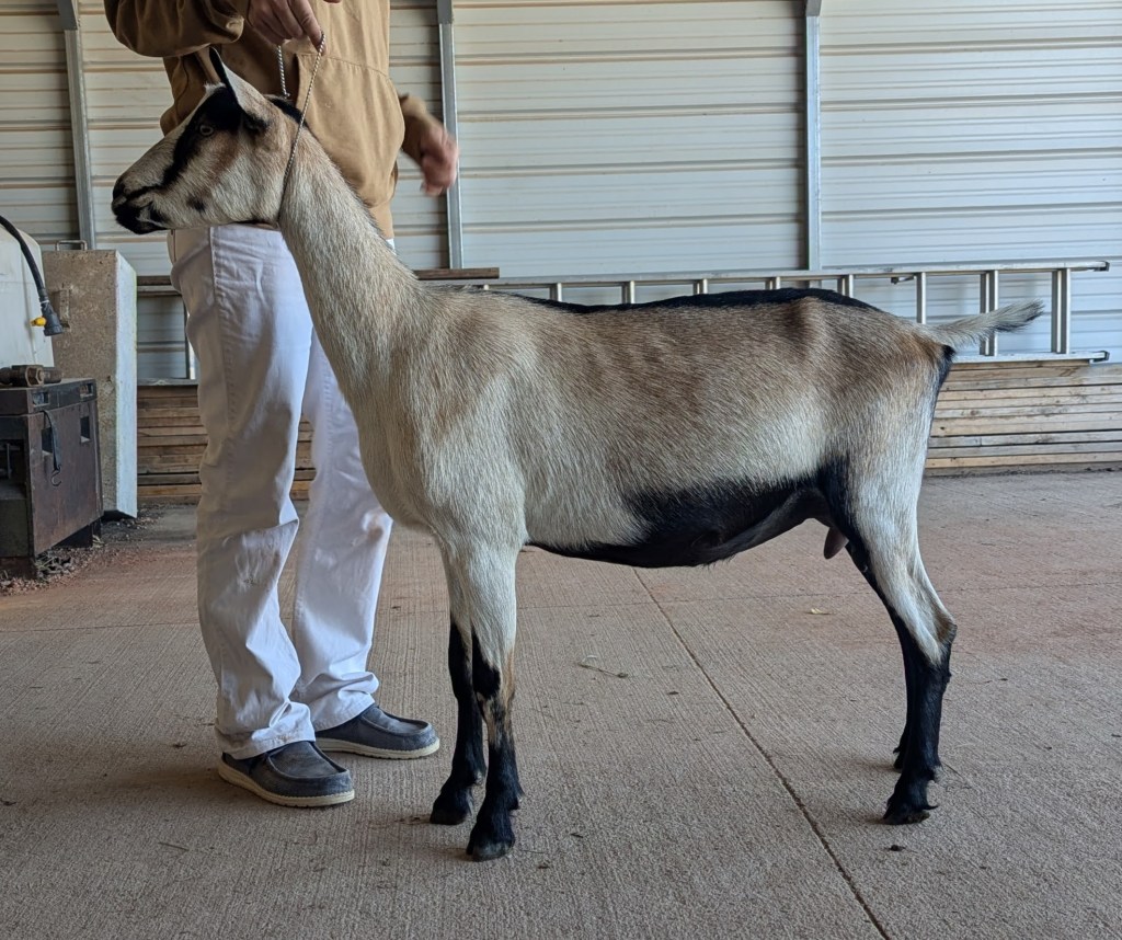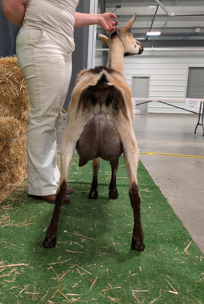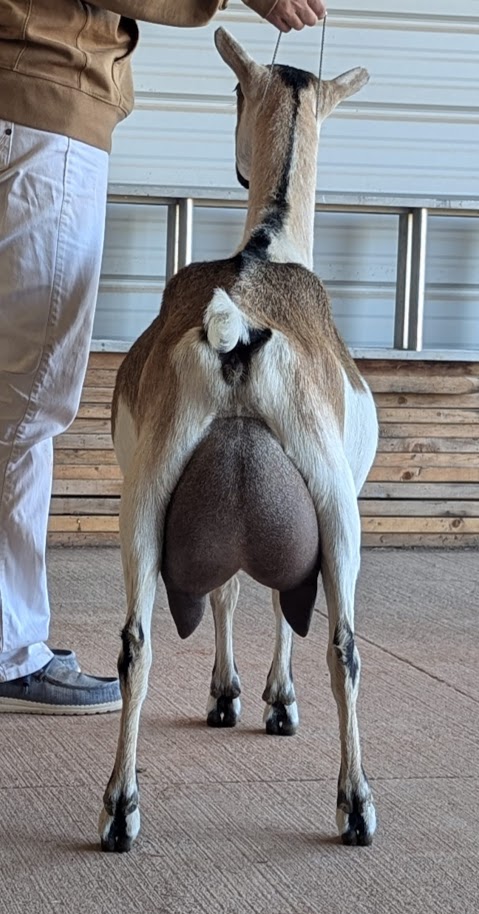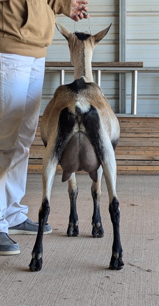 Rilla is a growthy young doe. She was quite the head-turner in the kid pen, then spent her yearling year a bit gawky, before rebalancing as a 2 year-old. Her udder lacks capacity for her frame, so we are hoping for more capacity as she grows. Lovely attitude, easy to have around.